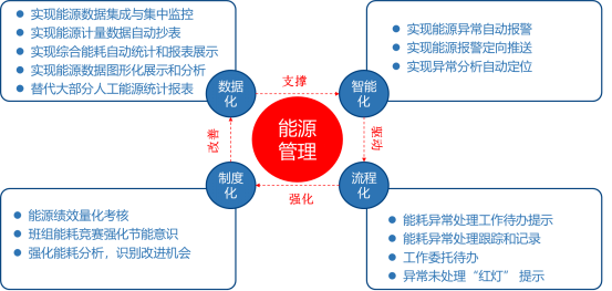 系统把关键能耗数据接入到移动终端APP,使企业领导“anytime anywhere”查看能耗实时状态,实现“一机在手,心中无忧”。同时系统主动监测能源绩效目标,当发生偏差后,推送责任人进行问题分析和处理,使能源管理工作管理闭环。