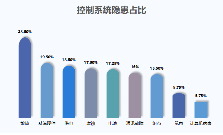根据中控技术历年点检/周期性检验测试项目的统计,控制系统运行中面临着多重安全隐患,主要表现在散热、系统硬件、供电、腐蚀、电池等九大方面故障: